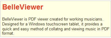 BelleViewer is PDF viewer created for working musicians. Designed for a Windows touchscreen tablet, it provides a quick and easy method of collatng and viewing music in PDF format.